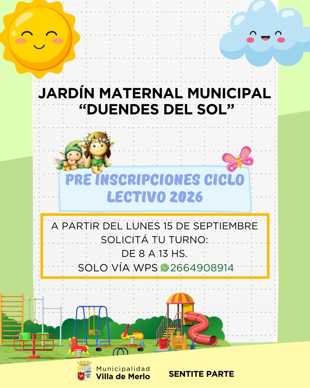 La Municipalidad de la Villa de Merlo anunció que desde el próximo lunes 15 de septiembre se habilitarán los turnos previos obligatorios para el ciclo lectivo 2026 del Jardín Maternal Municipal “Duendes del Sol”.