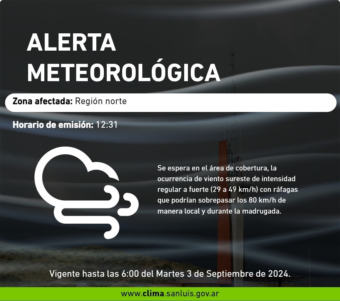 Se ha emitido un alerta para la región norte, donde se espera la ocurrencia de vientos del sureste de intensidad regular a fuerte (29 a 49 km/h) con ráfagas que podrían superar los 80 km/h.