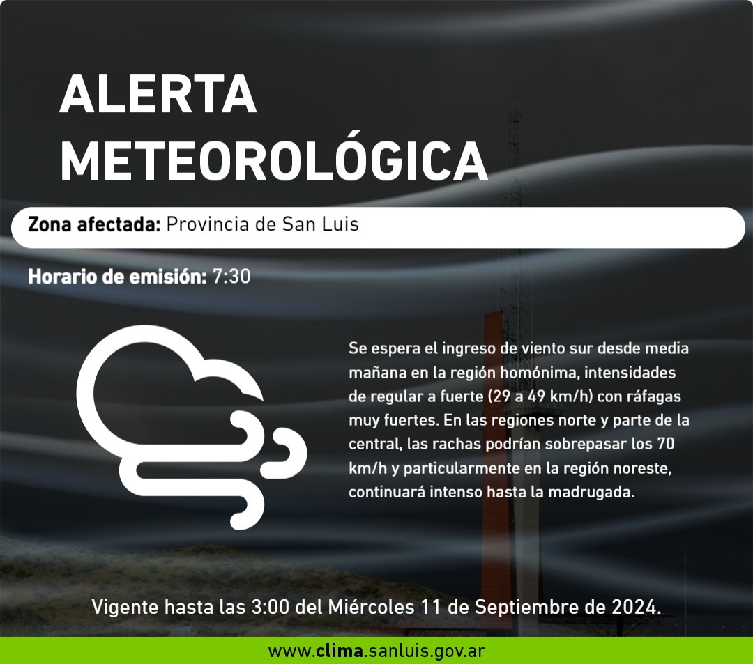 Emisión: 10 de septiembre de 2024 - 07:30hs. Vigencia: Hasta el 11 de septiembre a las 03:00hs.