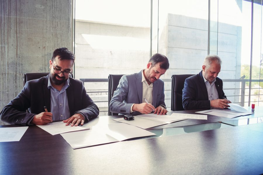 El convenio contó con Federico Cacace, Sergio Ribotta y el intendente, Juan Álvarez Pinto, para avanzar en hábitos energéticos más sustentables en la localidad.